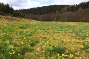 Het wandelpad naast de Jansbach brengt je naar de Narzissenwiesen (Duits voor ‘narcissenweide’). De Narzissenwiesen is een bekende locatie die druk wordt bezocht tijdens de bloeitijd van de wilde narcissen. Toch was bij ons bezoek de concentratie aan bloeiende wilde narcissen hier wat minder groot vergeleken met het dal van de Holzwarche. Mogelijk stonden nog niet alle narcissen in volle bloei.
